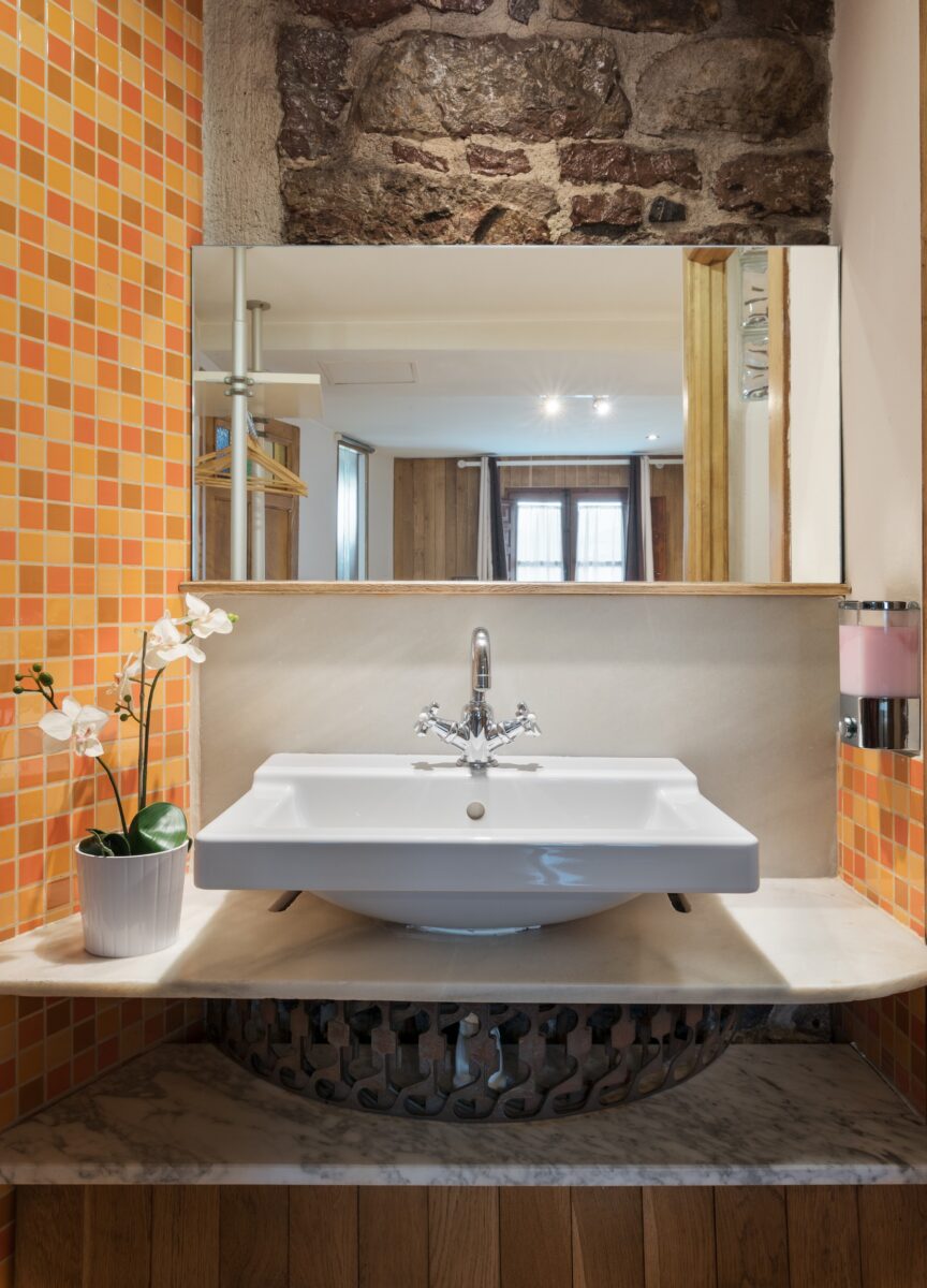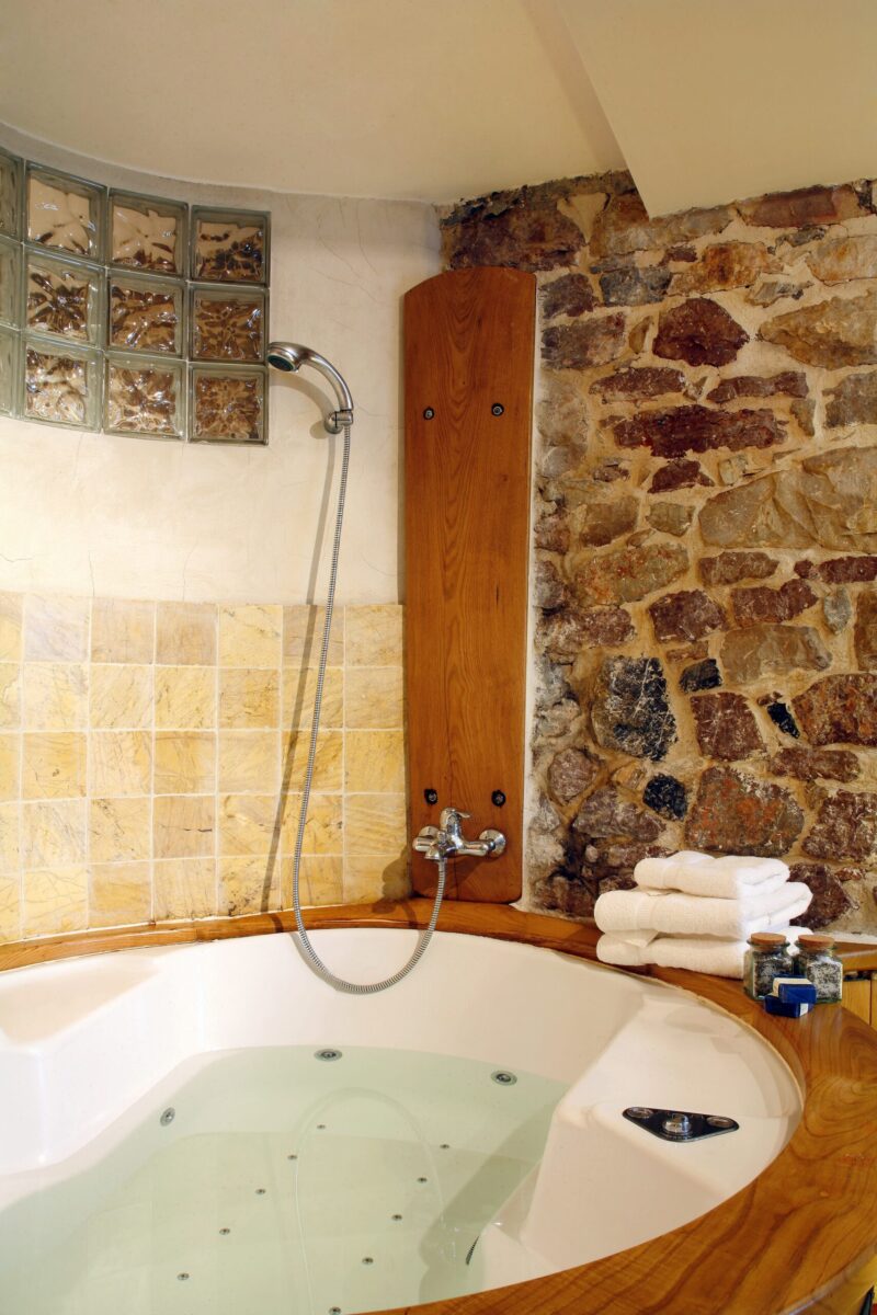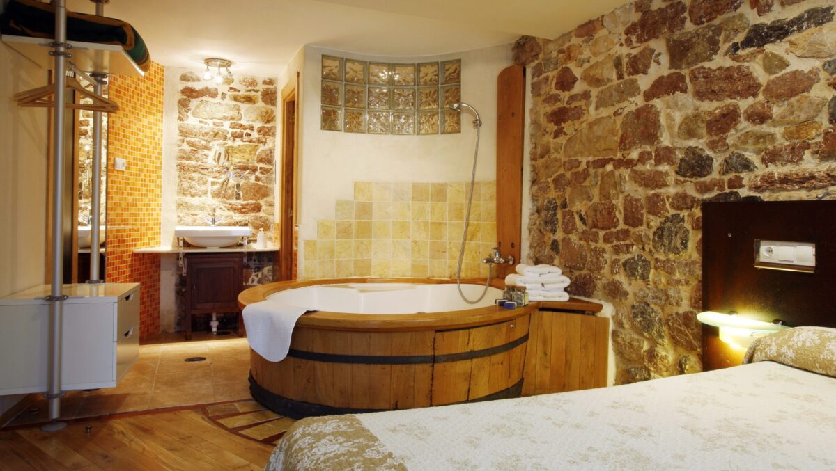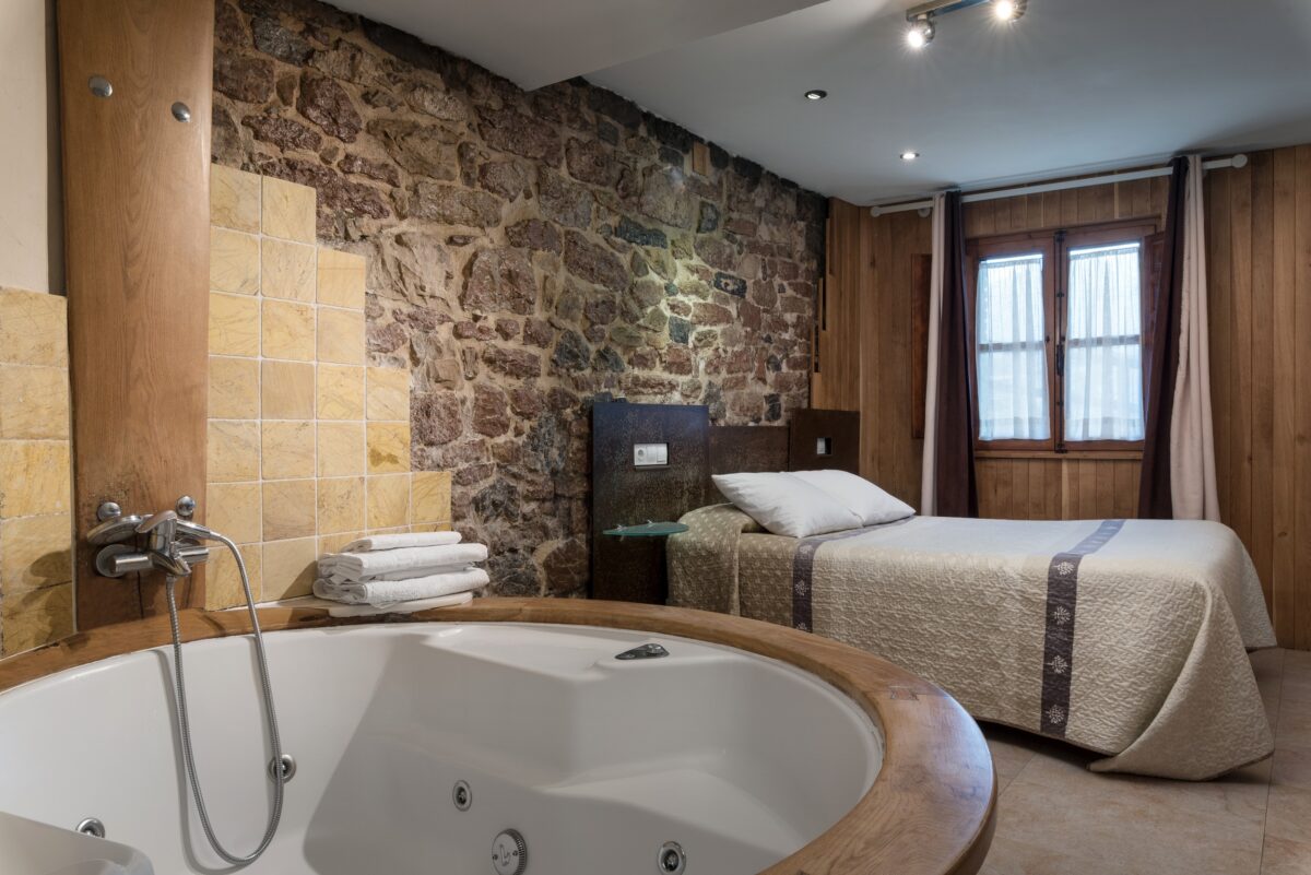 La habitación es un retiro romántico con un lujoso jacuzzi situado al pie de la cama, ofreciendo una relajante experiencia de baño única. La disposición de la habitación integra el lavabo y preserva el flujo natural del espacio, con paredes que presentan la apreciada piedra «rojo Covadonga». La pared de roble que separa el área de estar y la habitación forma un elegante arco, realzando la sensación orgánica y elegante de la habitación.