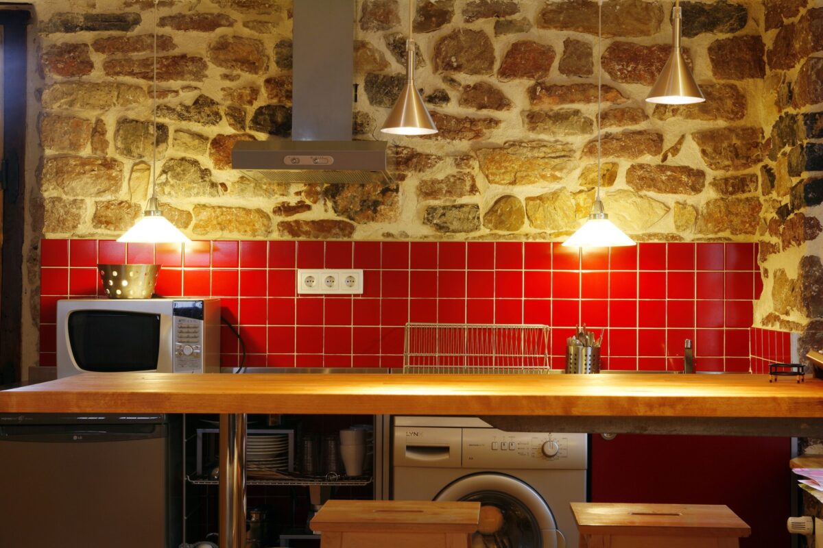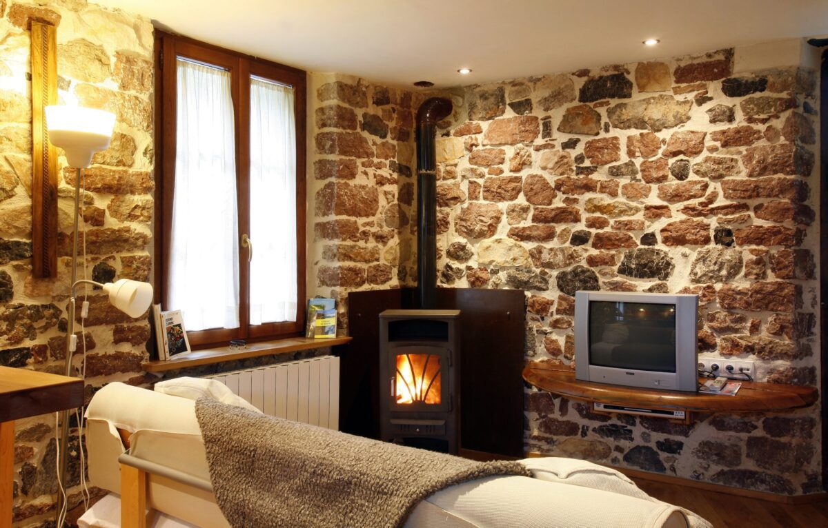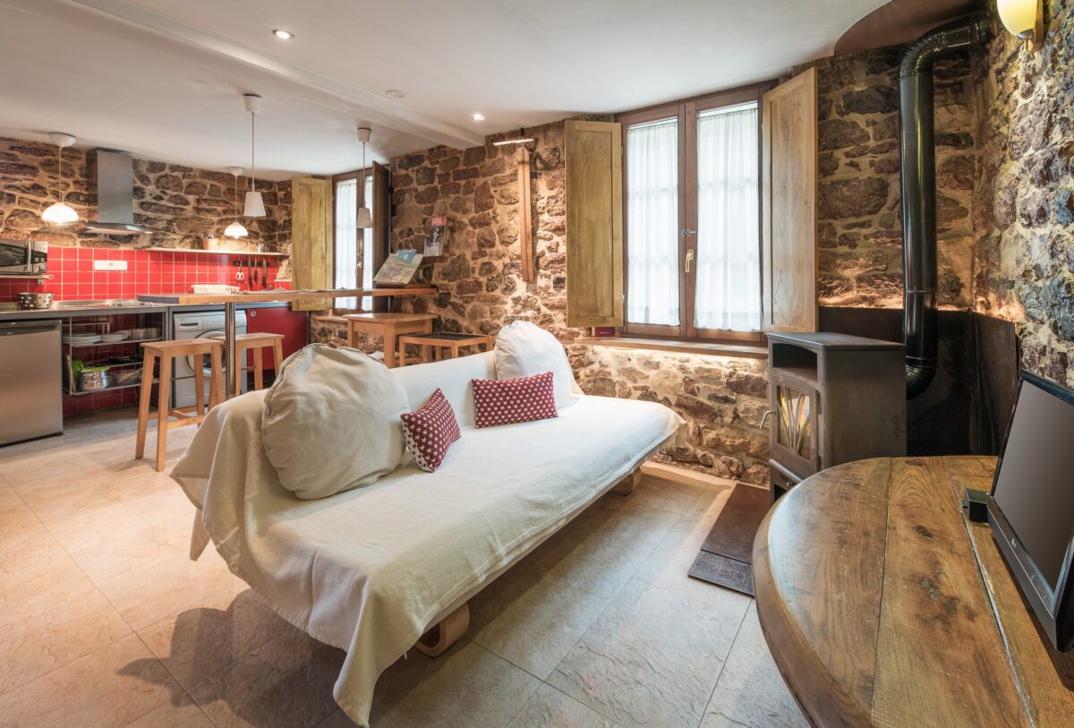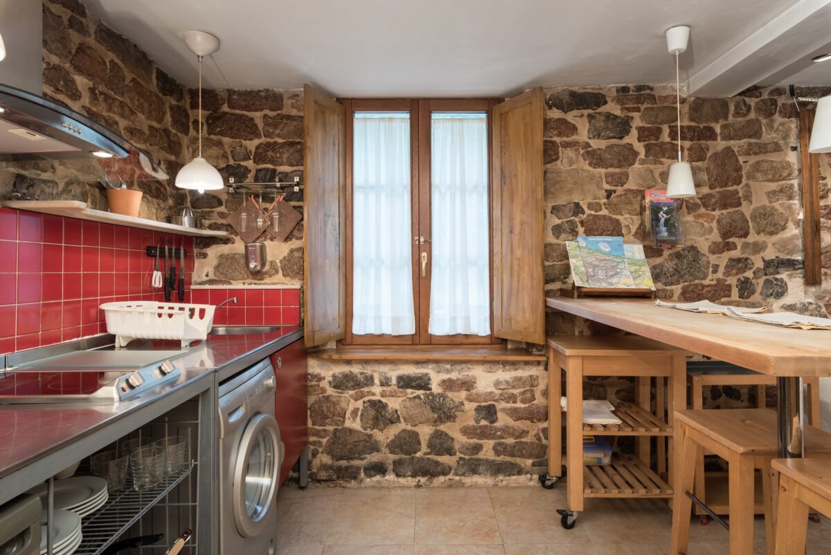 La combinación de salón y cocina es un espacio acogedor que cuenta con una cálida chimenea, perfecta para románticas veladas. La cocina está equipada con comodidades modernas, permitiendo a los huéspedes preparar sus comidas con facilidad mientras disfrutan del ambiente rústico. El uso de madera de castaño local y la distintiva piedra «rojo Covadonga» de canteras cercanas añade un toque de carácter regional y sostenibilidad a la decoración.