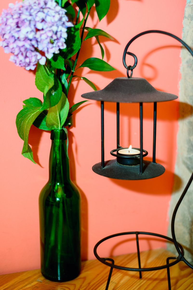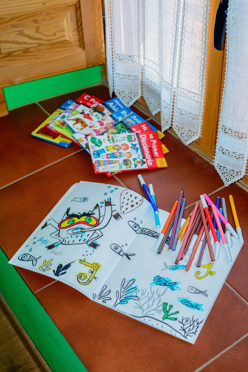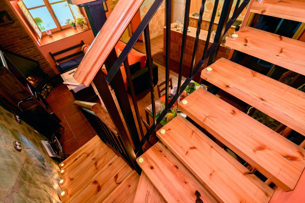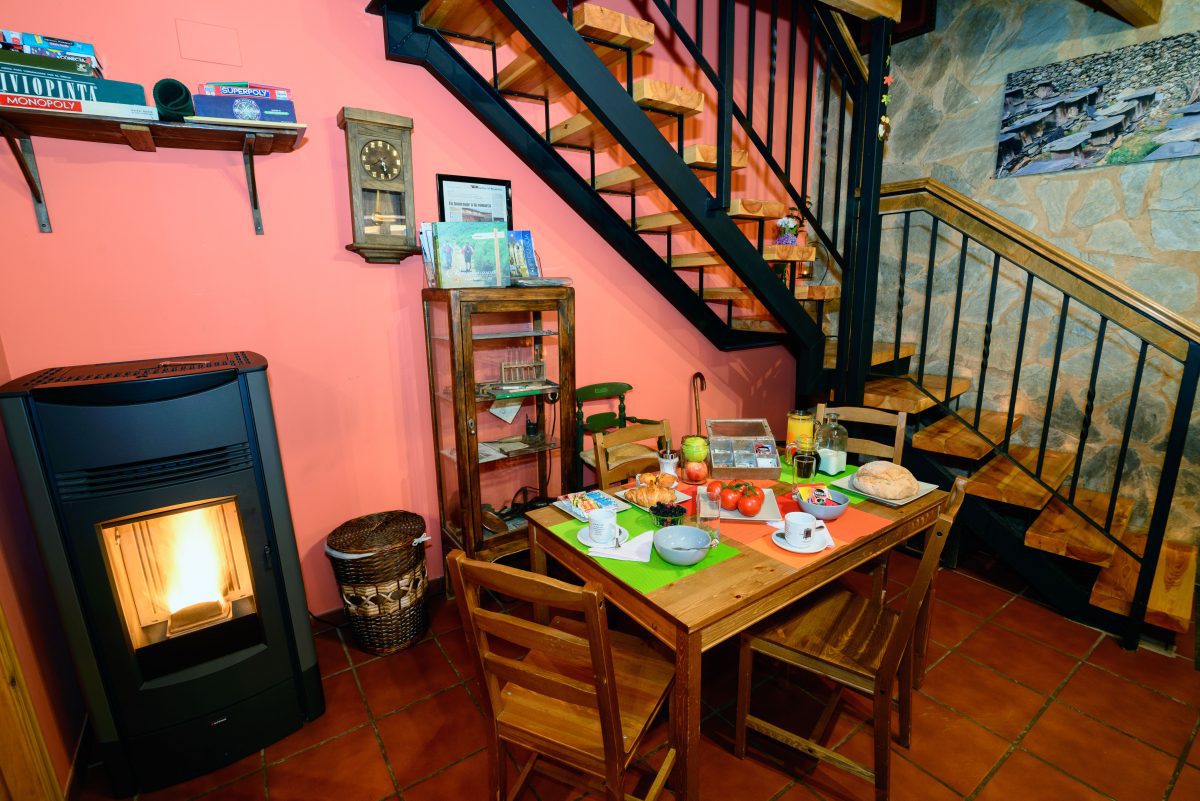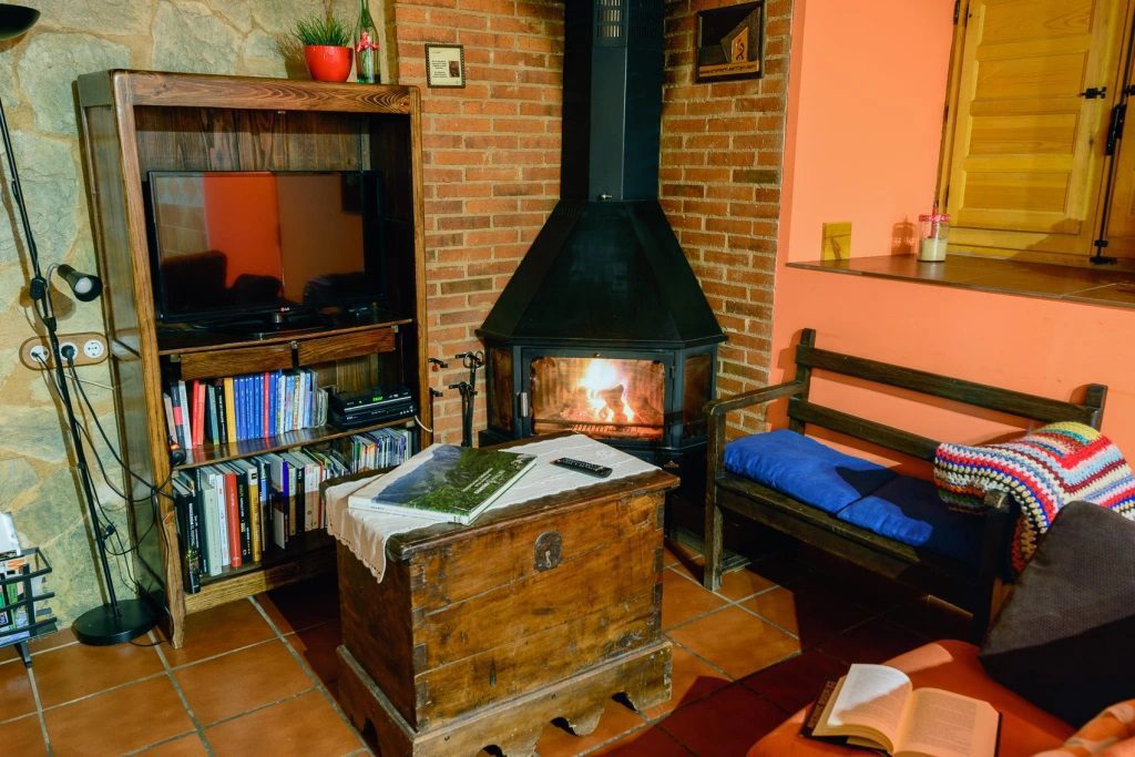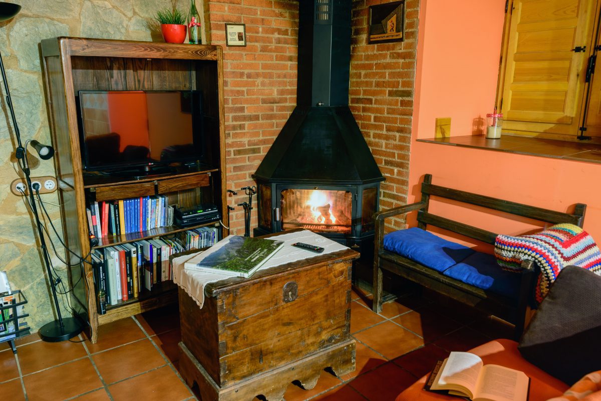 El salón tiene un amplia y confortable sofá y chimenea de leña para uso de los huéspedes, una escalera de forja y madera que parte de aquí nos permite acceder a la planta superior.