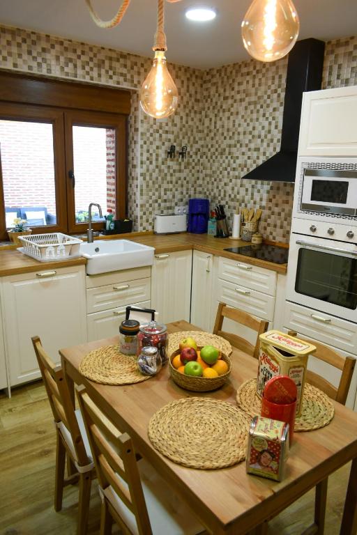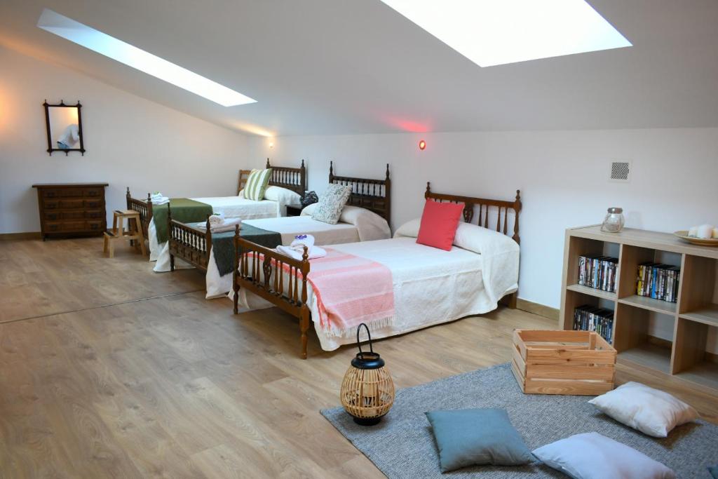 La casa rural consta de un amplio salón-comedor, una luminosa cocina totalmente equipada, un dormitorio principal con cama de matrimonio, un baño familiar, dos dormitorios con dos camas individuales en cada uno, un baño con ducha, en la parte superior de la casa se encuentra la suite loft abuhardillada de 130 metros cuadrados, con 1 cama de 135cm , 1 cama de 105 y posibilidad de 2 supletorias de 105 y un acogedor salón con juegos y sitio de lectura.