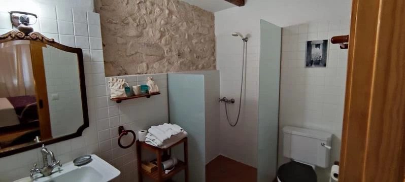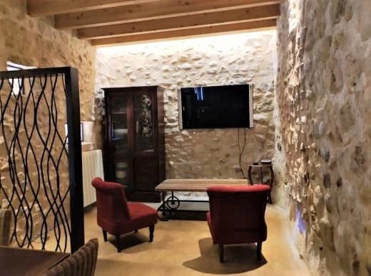 El hall de entrada es un espacio en uno de cuyos laterales encontrarás una mesa alta de madera rústica y cuatro sillas tipo barra de bar; se puede utilizar como espacio de trabajo, para tomar algo con amigos o familia o planificar la salida del día con los folletos y mapas a disposición del huésped en un mueble con vitrina. O lo que se te ocurra; está allí para ti y los tuyos.
