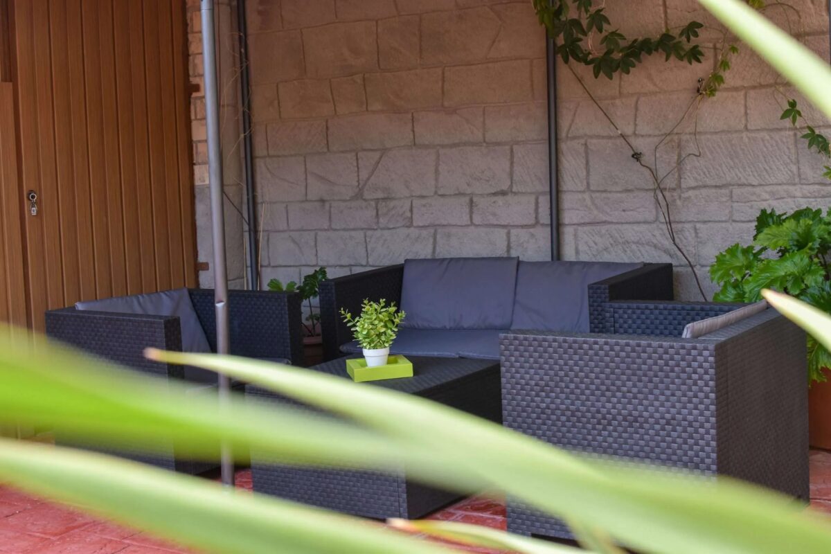 El patio de unos 150m, tiene barbacoa y mobiliario de terraza para poder comer o cenar en los días más calurosos, además, consta de un salón adjunto con mesa de billar y varios juegos de mesa donde podrás terminar el día de la mejor manera posible.