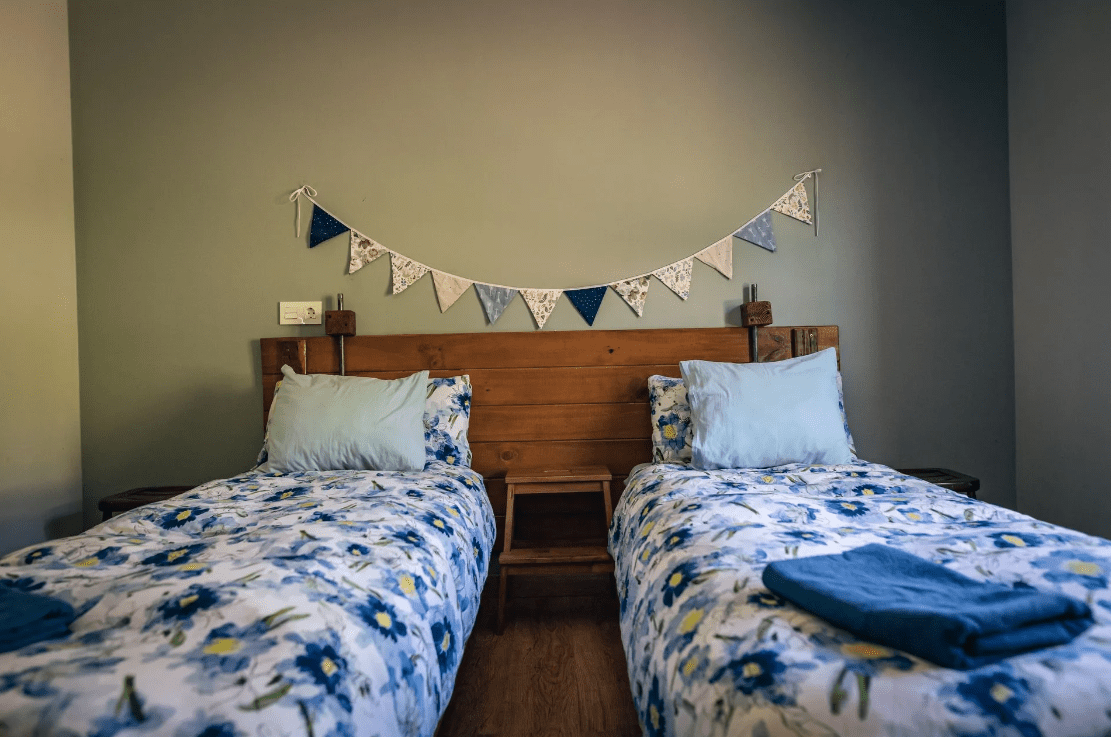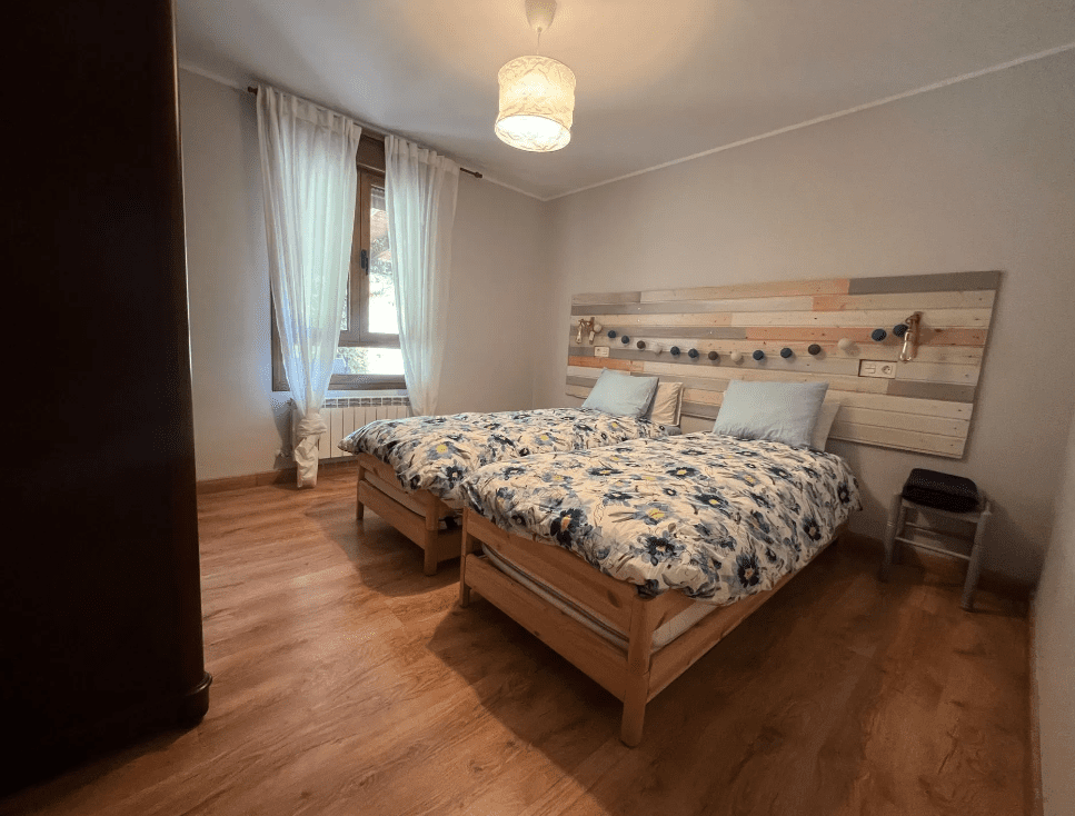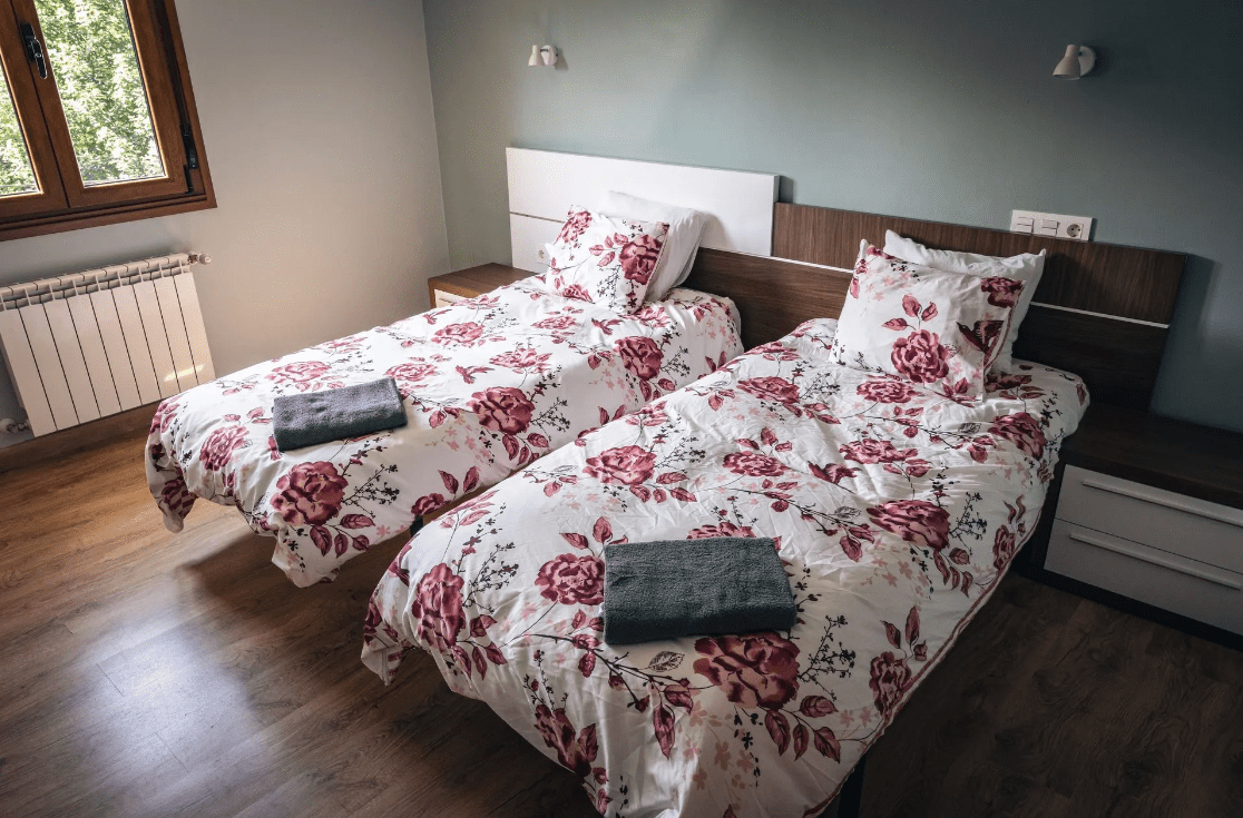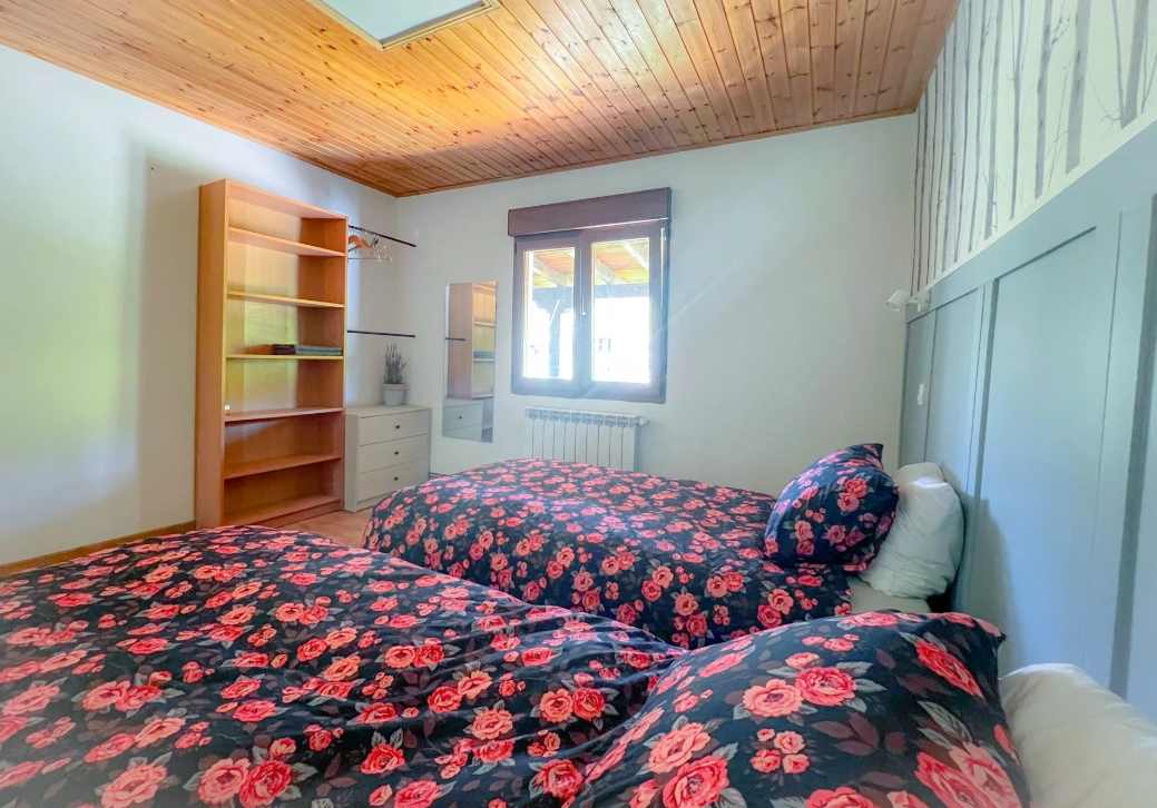 Se trata de una casa con dos entradas independientes, como dos casas adosadas. Cada parte de la casa tiene cuatro habitaciones dobles, dos baños, un salón, comedor y cocina. En total hay tres habitaciones con dos camas individuales, y otras cinco con camas de matrimonio. Además, en uno de los salones hay un sofá cama.