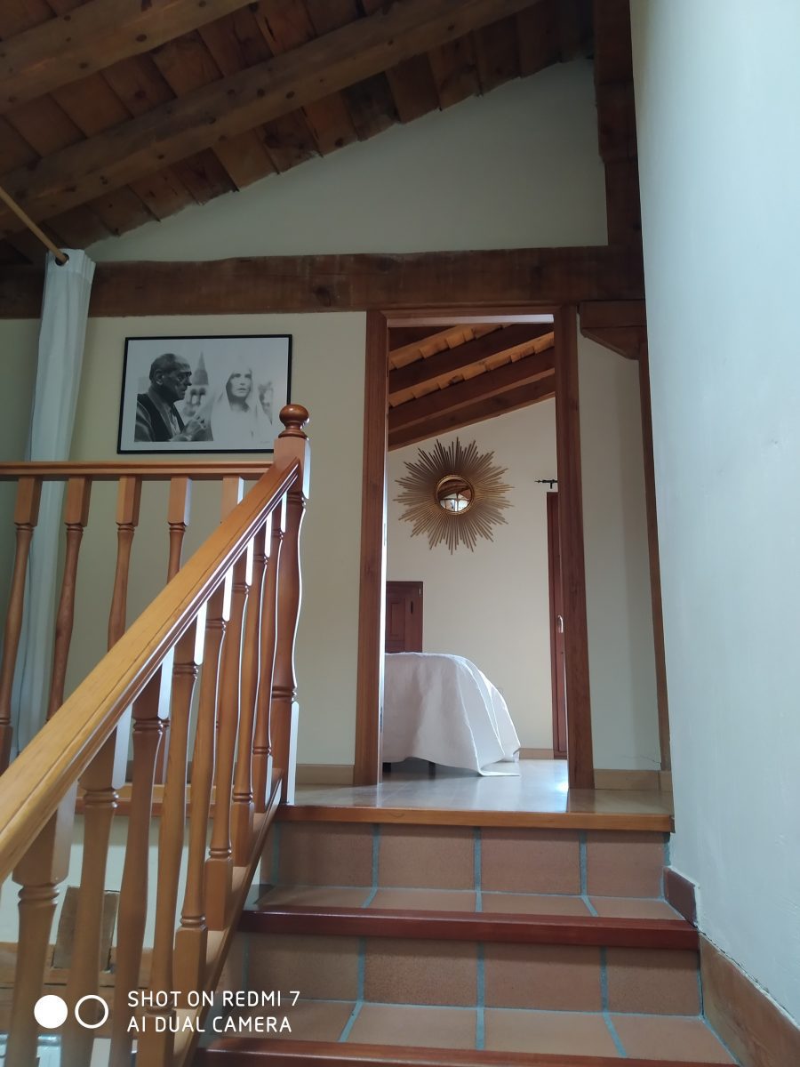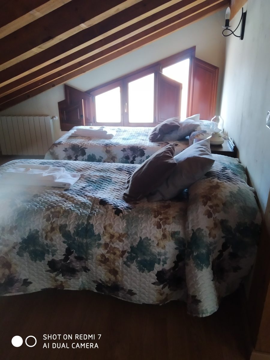 La planta superior se distribuye en tres dormitorios triples y baño completo con ducha: dos de ellos tienen cama de matrimonio e individual, uno de ellos abuhardillado; el tercero es también abuhardillado y abierto a la escalera, con tres camas individuales.